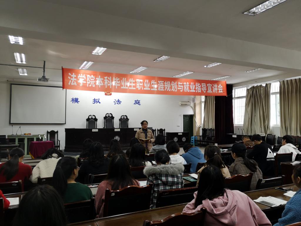 11月4日上午,法学院2021届本科毕业生职业生涯规划与就业指导宣讲会在模拟法庭召开,法学院党总支副书记黄莉、学生科科长周正颐以及2016级全体本科学生参加了会议。
