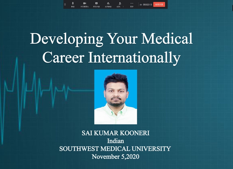 SAI KUMAR KOONER与大家分享了自己在医院工作的工作环境和工作情况,随后讲述了自己回国后的工作经历。KRISH SAHO首先感谢了学校对他的教育,以及学校对留学生实行的人性化分类管理,帮助由于疫情回国的他进行了考试和实习所需材料的认证,对他顺利通过FMGE考试以及签约实习医院起到了很大的帮助。两位校友针对来华医学留学生回国后的医学事业规划和发展做了分享和经验交流。分别对印度FMGE考试的学习策略政策解读以及疫情常态化形式下如何在印度成功签约实习医院的流程和经历进行了分享。讲座赢得了留学生们的热烈反响,他们的成功经验为来华留学生们提供了借鉴意义。