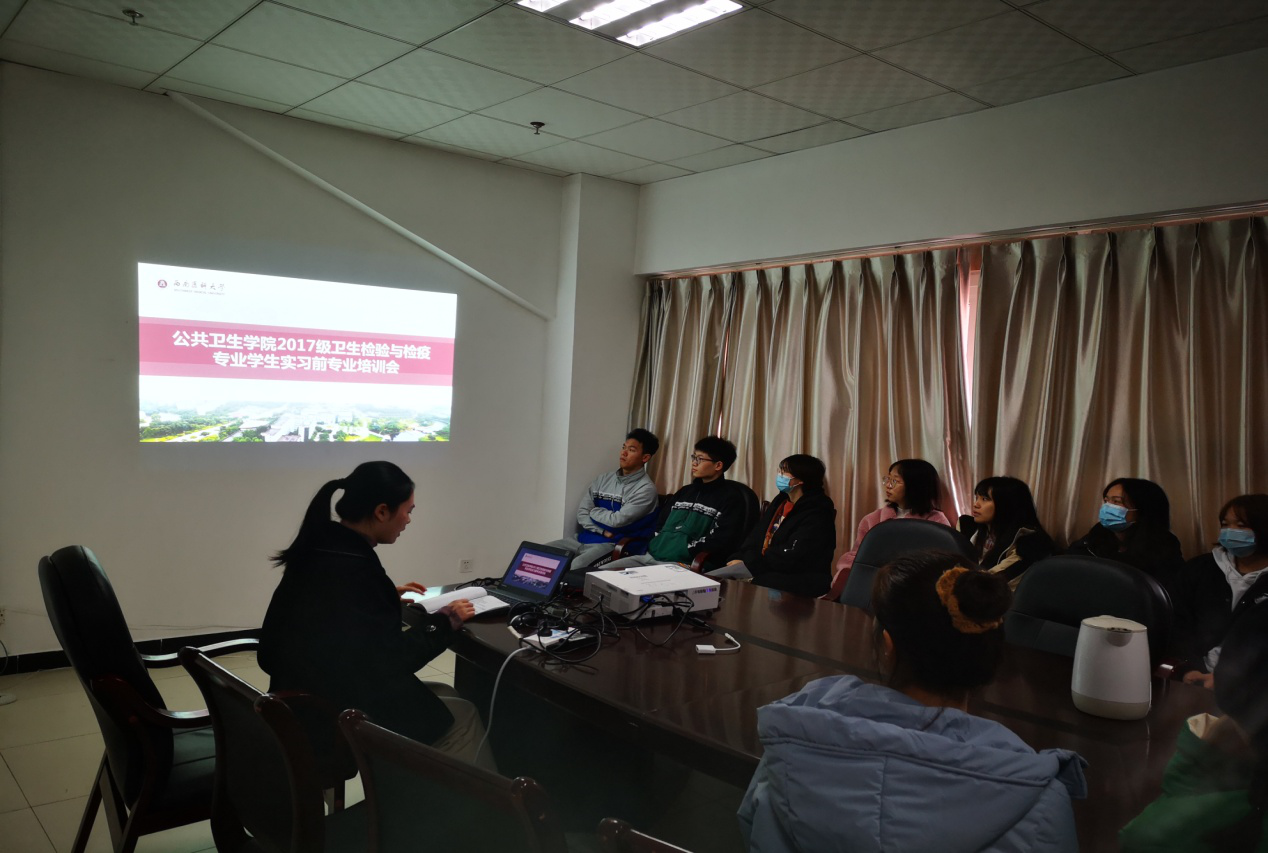 日前,公共卫生学院在学院会议室召开2017级卫生检验与检疫专业学生实习前专业培训会。本次培训主讲人为卫检教研室杨懿博士,2017级卫生检验与检疫28名学生参与本次培训。