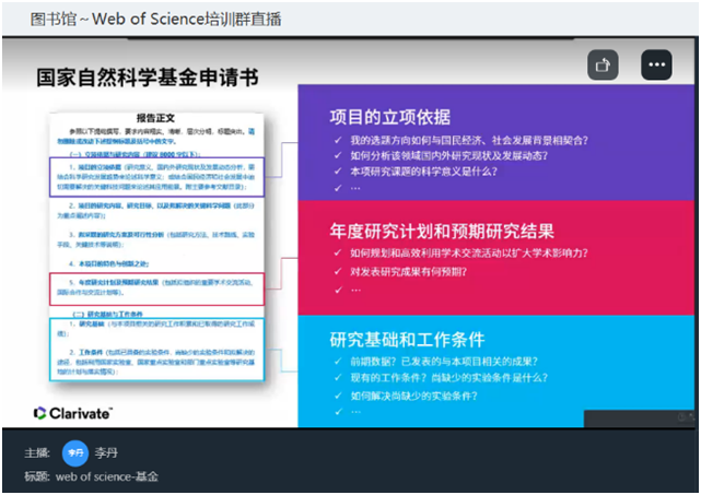 本次培训邀请了科睿唯安学术研究事业部专家李丹博士,作了“Web of Science在基金选题与申请书撰写中的应用”的专题培训讲座。内容围绕基金选题与申请书撰写,以Web of Science平台为科研人员提供多学科、多类型的数据资源为核心,结合Essential Science Indicators基础科学指标和Research Fronts研究前沿;从有基础的研究方向、项目指南、研究前沿与热点、国民经济以及社会发展背景等方面对基金选题和申报书撰写进行了较为全面的讲解,为beat365官网科研人员基金选题和申报书撰写提供新的视野和方法。