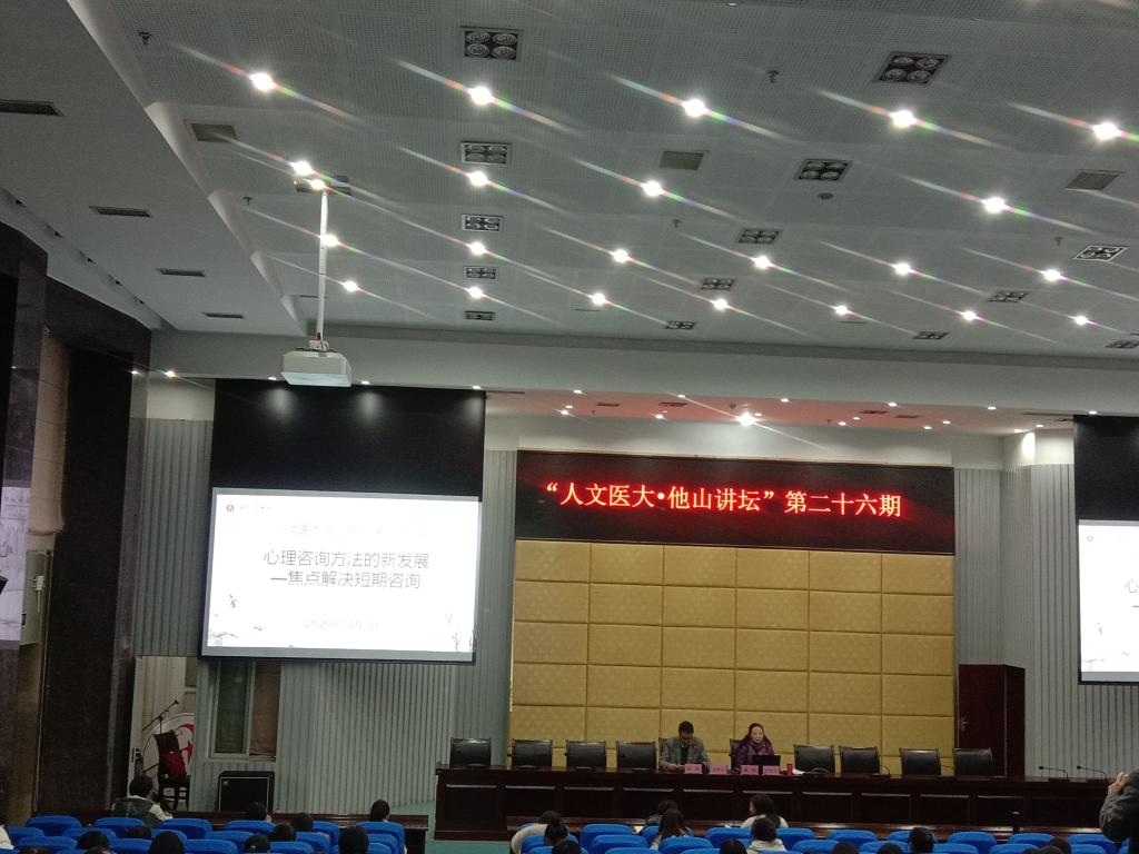为增进师生对心理咨询发展前沿模式的了解和认知,人文与管理学院12月3日举办第二十六期“人文医大•他山讲坛”。本次讲坛邀请了四川师范大学心理学院教授戴艳作题为《心理咨询方法的新发展——焦点解决短期咨询》的讲座,讲座由人文与管理学院党总支书记陈屹主持。学院部分教师和心理学专业学生共200余人聆听了讲座。