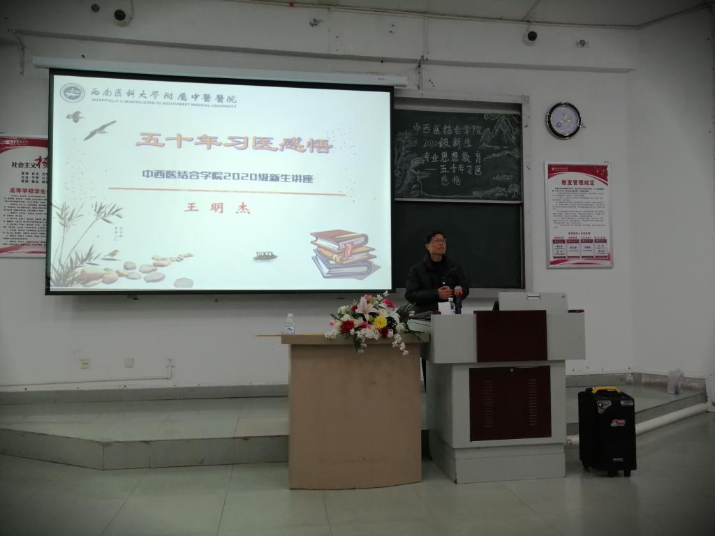 12月6号下午,中西医结合学院于鸿文楼101教室举行2020级新生专业思想教育之“五十年习医感悟”专题讲座,本次讲座由四川省名老中医、原beat365官网附属中医医院院长王明杰教授主讲,学生科科长谢晓东,2020级辅导员周霞及2020级全体同学参加了此次讲座。