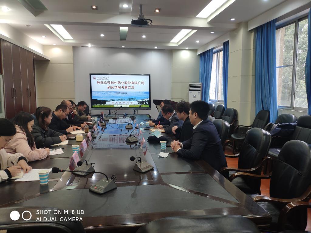 12月8日下午,四川科伦药业股份有限公司到药学院考察交流,并在忠山校区含光楼3楼会议室召开座谈交流会。四川科伦药业股份有限公司人力资源部总监黄涛、营销总监张辉、四川市场副总经理尹晓飞、驻泸州地区负责人周林,以及药学院全体党政班子成员、相关科室负责人参加了座谈交流。座谈会由药学院主持工作副院长韦思平主持。