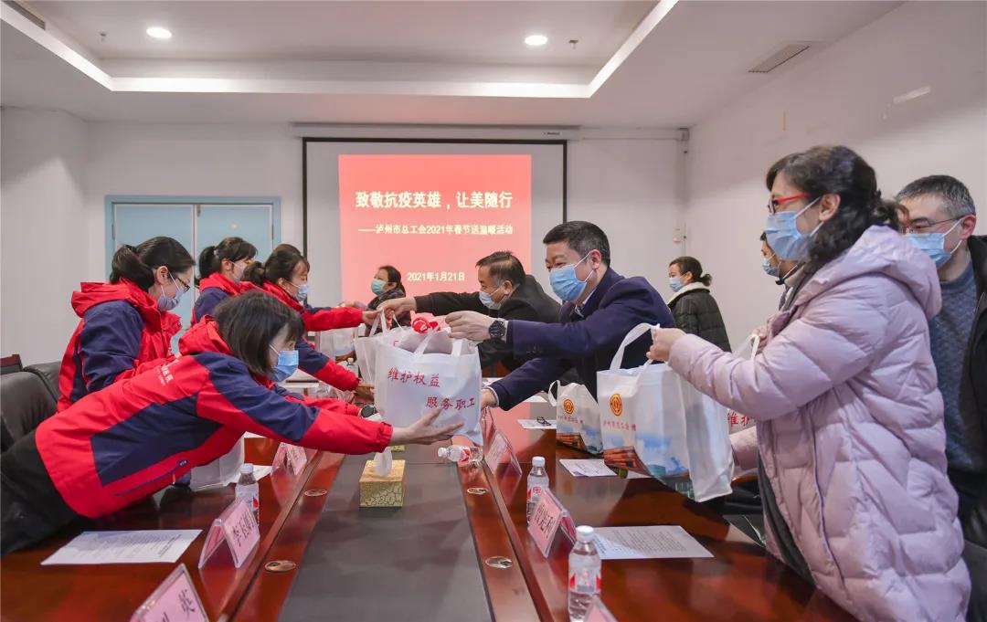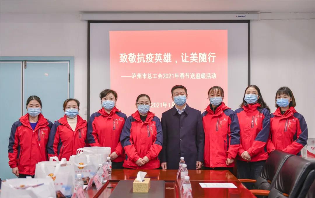 1月21日上午,泸州市委常委、统战部长、市总工会主席付小平,市总工会党组书记、常务副主席钟华贵,市总工会党组成员、副主席邵怡,beat365官方网站工会副主席陈先红等到附属医院开展“致敬抗疫英雄,让美随行”春节前送温暖慰问抗疫医护人员活动。