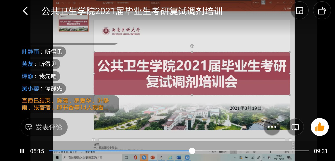 为帮助毕业生争取更多的升学机会,公共卫生学院于3月19日通过钉钉在线平台召开了2021届毕业生考研复试调剂培训会。公共卫生学院青年教师、在读研究生谭静和吴小蓉担任培训教师,学生科科长彭丽冰主持培训会。