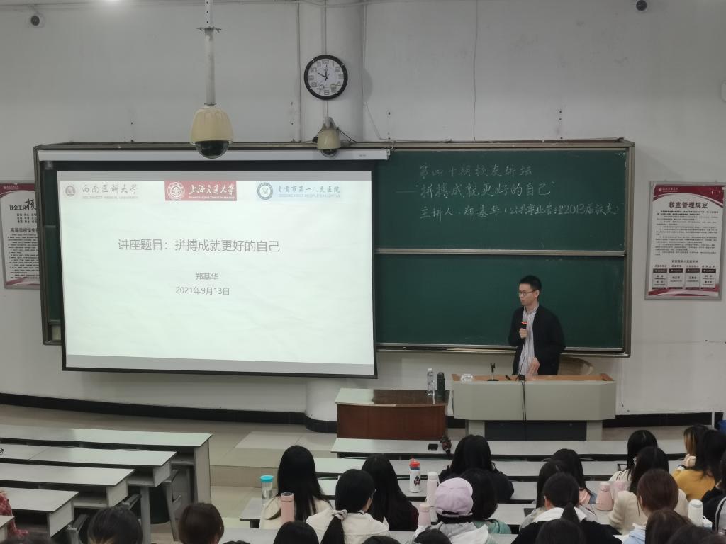 讲座中,郑基华从学习、考研、工作三个方面与同学们进行了分享。在学业指导方面,他劝勉各位同学:要珍惜大学时光,在最美好的时光做最有意义的事,不给自己留遗憾;要学好专业课,提高学分绩点,同时积极参加课外活动,全面发展自己;要敢于做自己想做的事,不断突破自我;要发挥自己的优势和特长,不断取得更好的成绩;要有专注力,把一件事情做到极致。在考研指导方面,他勉励同学们:要有自己的目标,知道自己想要什么;针对考研,要确定自己的目标院校,并做全面分析;要有持之以恒的决心和信念;要与时间为友,有始有终。在工作经验分享方面,他开诚布公地与在座师生分享到:自己是先工作后再考取的上海交通大学硕士研究生,宝贵的工作经历为自己的考研打下了重要基础,重点在于自身在心智方面更为成熟,考研目标也更为明确;在工作中要善于学习,并坚持理论与实践相结合;要抓住工作的重心,有针对性地看待和解决工作中的问题,勤于总结;要勇于创新,敢于突破,积极获得领导的认可;要辩证分析,用全面的观点看问题,抓住主要矛盾并突出重点。