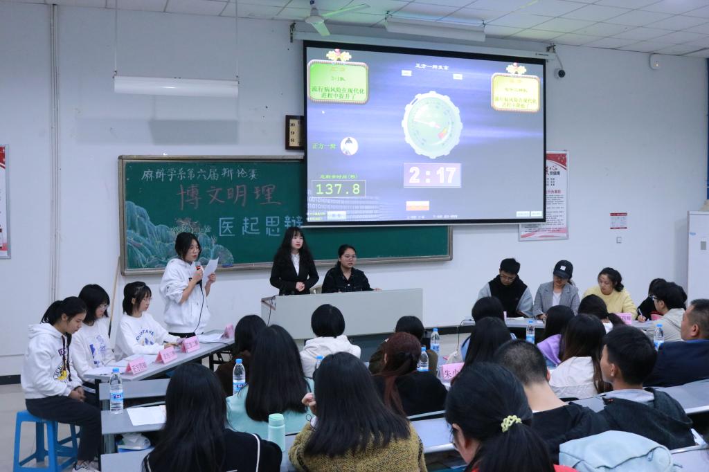 古有卧龙诸葛舌战群儒,今有群英荟萃慷慨陈词。为增强同学们的逻辑思考与语言表达能力,麻醉学系于10月20日晚在海川楼314举办了“博文明理,医起思辨”第六届麻醉学系辩论赛决赛。麻醉学系辅导员和辩论队指导老师金川,四个辩论队及150余名观众参加此次活动。