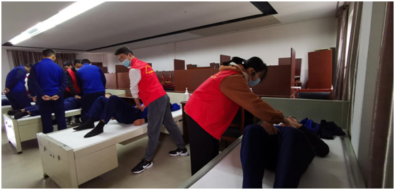 一上午时间,同学们为肩颈部不适的消防员们进行软组织松动和神经松动,结合调整呼吸方式与自我软组织松动;为腰部不适的消防员们放松腰大肌、激活多裂肌、纠正不良坐姿、改变呼吸模式等;为膝关节疼痛的消防员们松动髌股关节、激活大腿与髋关节肌肉等。一番处理后,大部分人员的症状得到了有效缓解,对同学们的耐心细致服务和专业实践能力频频点头称赞,表示同学们的康复治疗服务在很大程度上解决了他们在日常训练时困扰其的运动损伤与疾病。