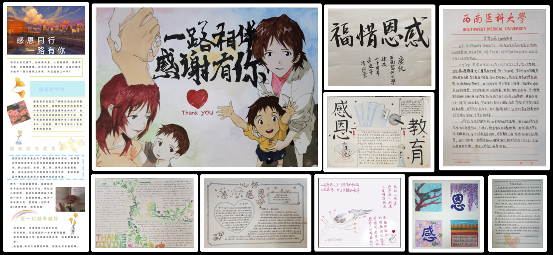 为培养学生知恩图报的良好品德,11月13日至12月8日,基础医学院基础学工办开展了“感恩教育,资助育人”作品征集活动。基础医学办的同学积极参与,本次活动共收到作品60余件,作品内容丰富多彩,充分展现了同学的感恩情怀。