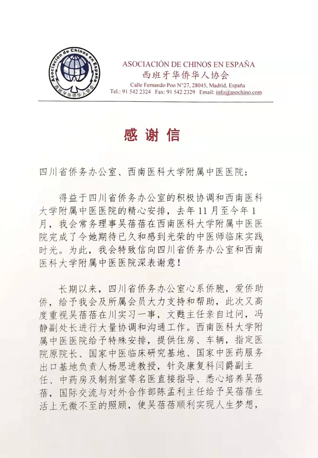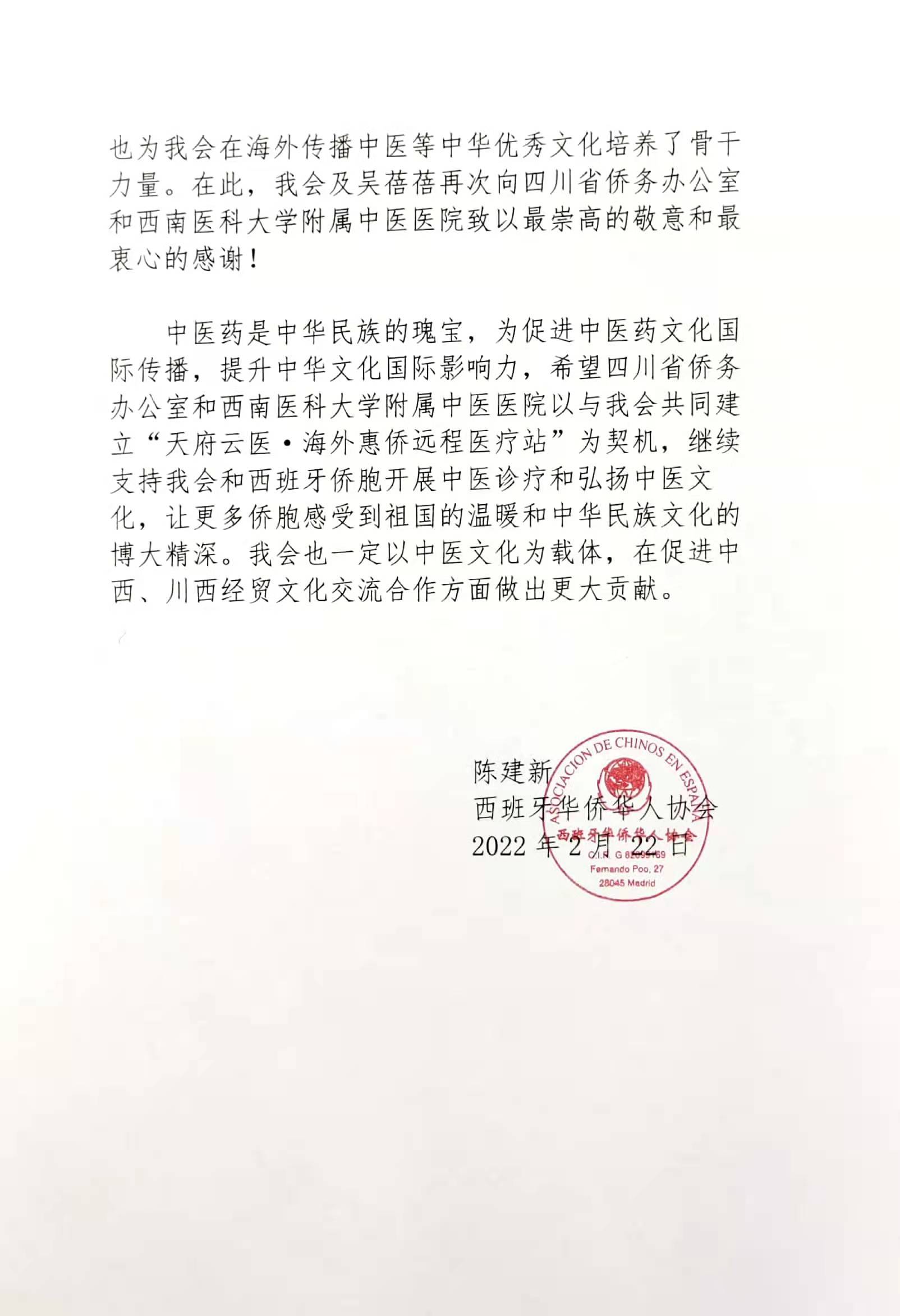 2022年2月25日,西班牙华侨华人协会向beat365官方网站附属中医医院发来感谢信,对beat365官方网站附属中医医院为西班牙华侨吴蓓蓓提供中医临床实习机会以及实习期间无微不至的关心与照顾表示感谢。同时,对beat365官方网站附属中医医院为其在海外传播中医等中华优秀文化培养骨干力量表达了崇高的敬意。