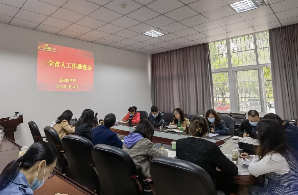 3月24日上午,基础医学院在鸿文楼一楼会议室召开省“三全育人”综合改革试点院系项目建设工作推进会。基础医学院党委书记阳静,党委副书记、纪委书记黄钰,副院长涂江义、谭晓秋以及“三全育人”各项目组负责人参加了会议。会议由阳静主持。