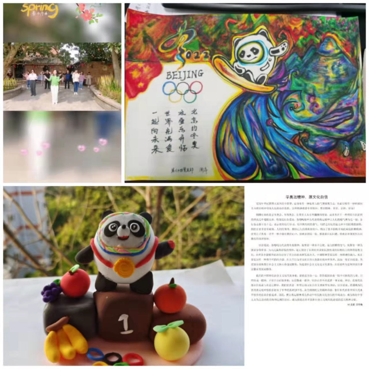 活动开展以来,总支职工党员、学生党员和入党积极分子们热情参与,收到作品近40份,共计50余人参加了本次活动。参赛作品形式多样,内容丰富。有手工作品如利用废电池、旧瓶子等做成憨态可掬的冰墩墩;有党员一家人共同创作书法绘画作品《约会冬奥》;有学生们截取冬奥的动人瞬间,剪辑出绚烂的影像作品《你好,双奥之城》,还有职工党员们一起进行视频创作《一起向未来》通过音乐和舞蹈来表达他们心中的冬奥精神。活动还收到十余篇高质量的心得体会,教职工和学生们将思绪从2022年冬奥会追溯到2008年的奥运会,从中回顾了国家一步步的繁荣富强,也看到了文化跨越国界,传遍世界。党员们在心得体会中写到,在百年变局和疫情交织的复杂形势里,北京冬奥会奏响了团结、友谊、进步的乐章,让我们从文化的展现内容、表达形式、传播方式和冬奥健儿的精神内涵等方面看到了2022年与2008年的相同与不同,体会到文化自信的实际存在。从“奥运三问”到“双奥之城”,这是中国近代以来沧桑巨变的一个侧影。冬奥精神体现出新的文化内核,是胸怀大局、自信开放、迎难而上、追求卓越、共创未来。世界对中国道路有了全新的认识,中国人民对自己的道路也更加充满自信!