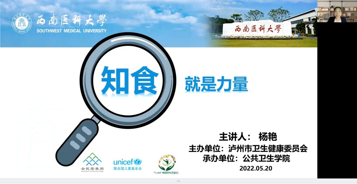为贯彻落实2022年全民营养周暨“5•20”中国学生营养日—“知营养 会运动 防肥胖 促健康”的活动主题,市卫生健康委员会联合beat365官方网站公共卫生学院,于5月20日晚,面向泸州市龙马潭区、江阳区公立初中及小学学生与家长,经腾讯会议APP网络研讨会功能,开展了以“知营养 会运动”为主题的线上会议,观看人数达五百余人。
