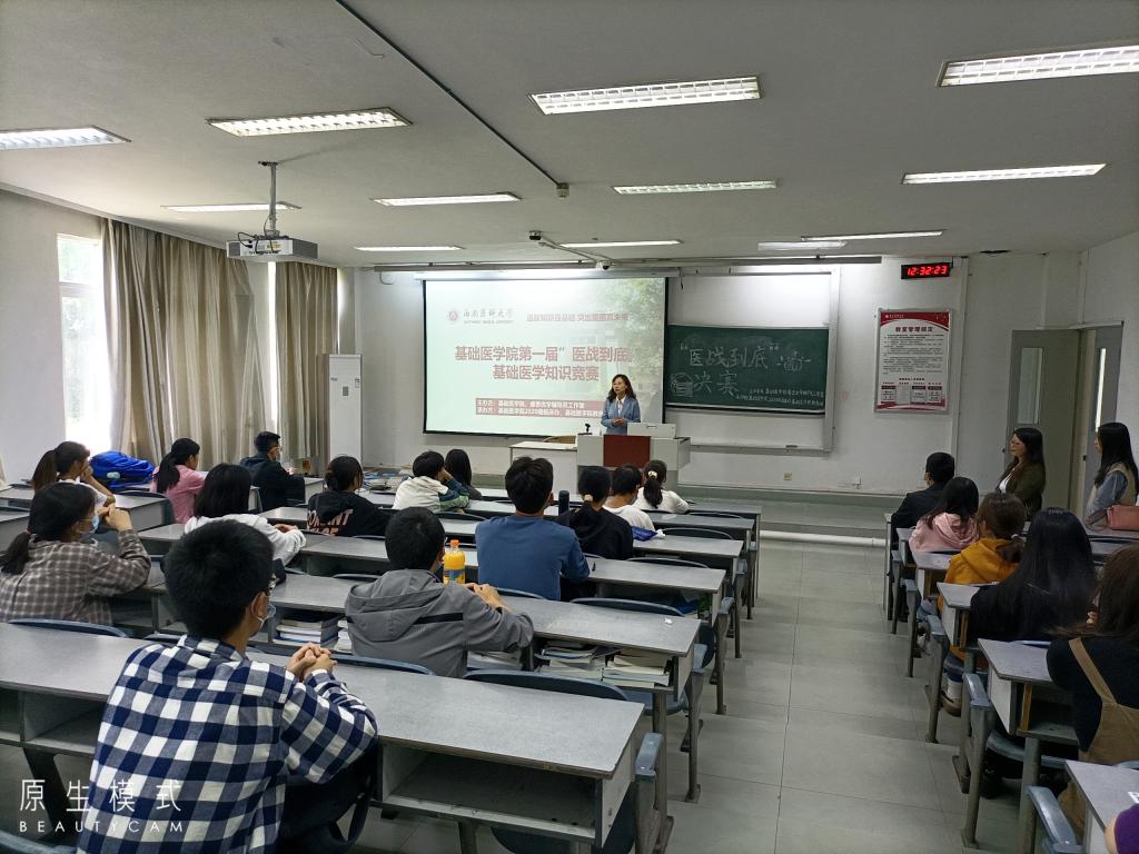 为提高学生专业技能和综合素质,营造温故知新的良好学习氛围,培养学生对医学知识的兴趣和积极性,基础医学院于5月16日中午在鸿文楼102举办第一届“医站到底”基础医学知识竞赛总决赛,本次竞赛由基础医学院、睿思优学辅导员工作室主办,基础医学院2020级临床办、基础医学院教务科承办,近四百人参加了初赛,由初赛胜出的29名同学参加本次决赛。