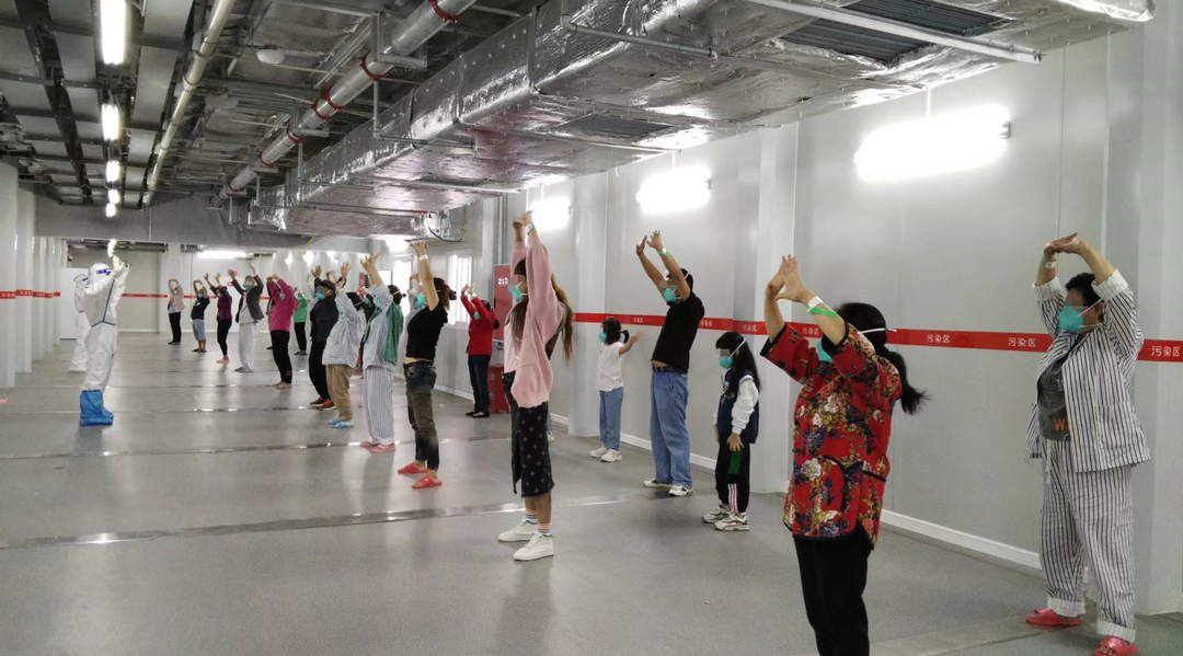 医疗队还利用空余时间,通过视频教学、现场示范等方式,带领志愿者及患者学习八段锦、经脉功等中医功法养生操,在志愿者们的带动下,越来越多的患者加入到了锻炼的队伍。