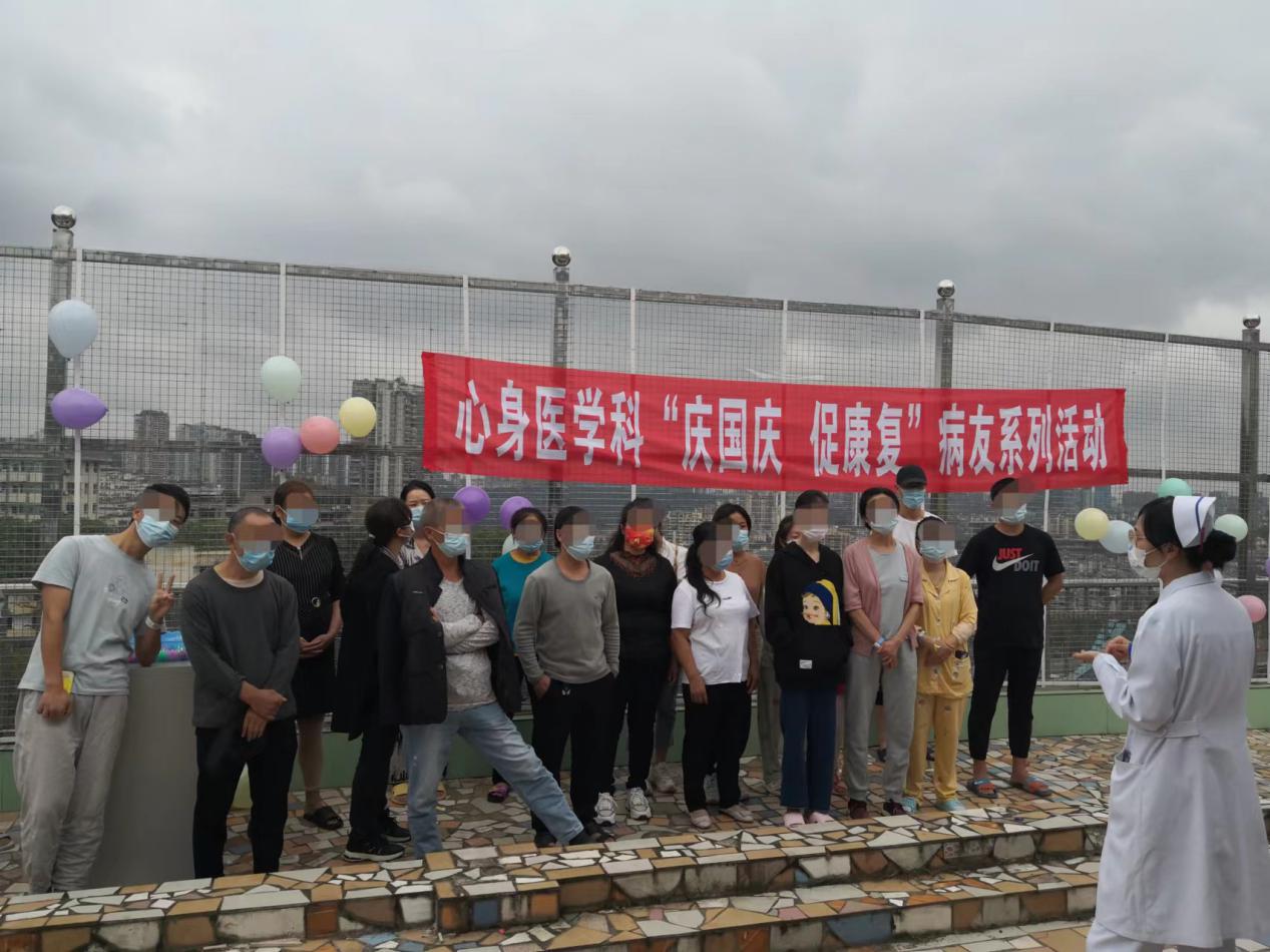 由于近期疫情反复,附属医院心身医学科全面实施了封闭管理,为促进患者康复,增加患者住院依从性,国庆节期间,心身医学科(第十一党支部)组织病友们在病区露天阳台进行了丰富多彩的“庆国庆,促康复”主题系列活动。
