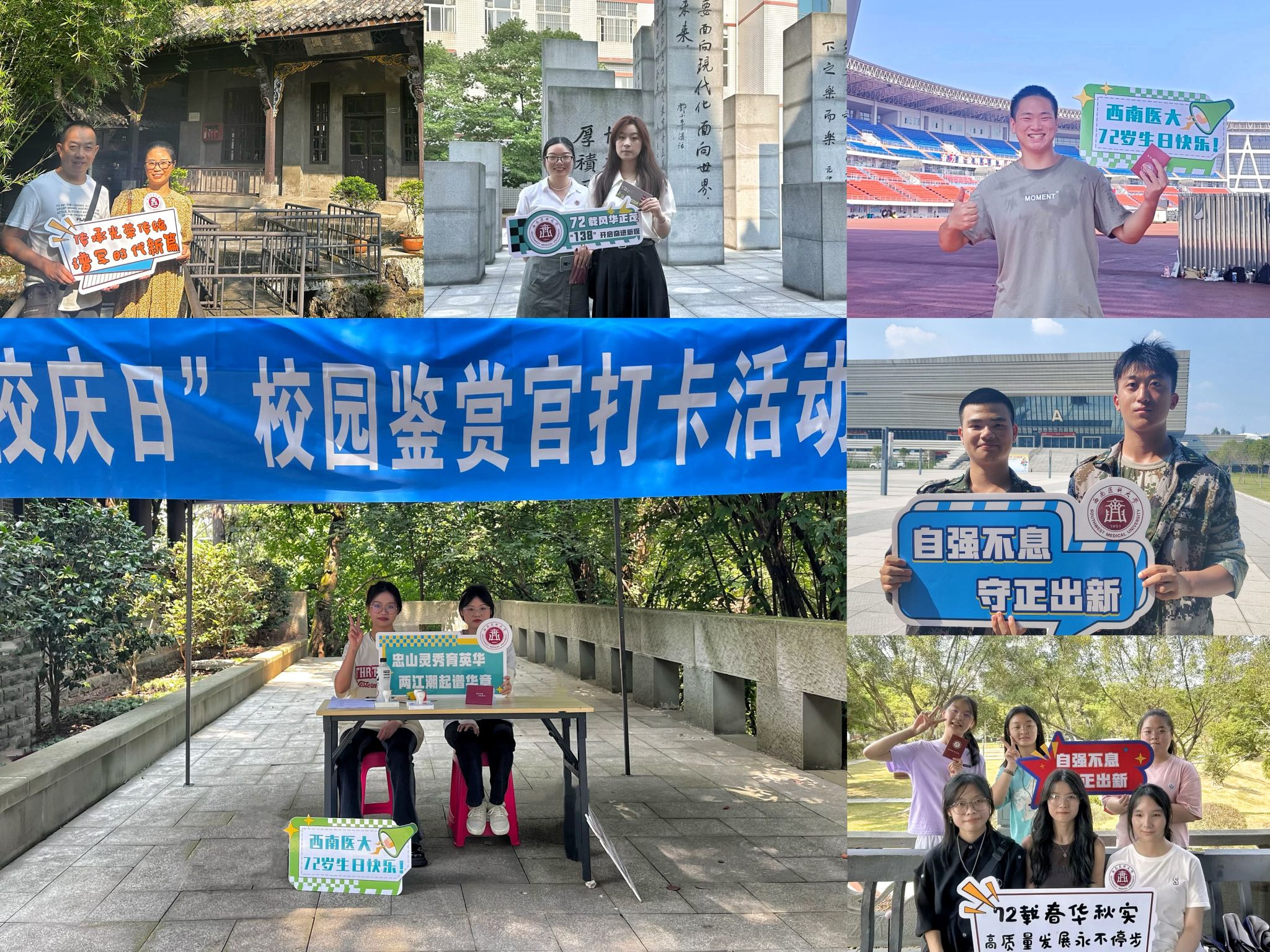 以氛围营造为载体,主打“情怀牌”。“西南医大,72岁生日快乐”“72载春华秋实,高质量发展永不停步”“72载风华正茂,‘138’开启奋进新程”“传承光荣传统,谱写时代新篇”……当师生们手举校庆纪念牌,在各个校园景观点位拍照打卡时,脸上都洋溢着灿烂的笑容。为了更好地营造浓厚校庆氛围,凝聚广大师生校友爱校荣校的情怀和力量,此次活动以师生喜闻乐见的方式,将情怀植入到底,不仅制作了纪念牌供师生拍照留念,还在两校区打造了氛围小品,引得师生积极参与、纷纷点赞。作为新生,2023级精神医学2班的席唯分享到:“活动结束之刻,看着精美的印章,归属感油然而生,心中不禁涌出一句‘你好,我的大学!’很幸运,我的19岁遇上西南医大的72岁,未来,希望通过自己的努力,真正成为一个‘厚德精业,仁爱济世’的西南医大人,不负青春,不负母校。”