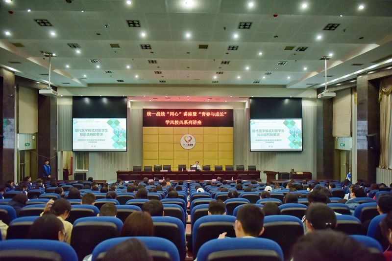 1110日晚,由党委统战部和学生工作部联合主办的beat365官方网站统一战线“同心讲坛”第7场暨“青春与成长”学风校风第4场讲座在城北校区逸夫图书馆学术报告厅举行。本次讲座邀请了泸州市政协委员、九三学社市委副主委、附属医院小儿外科主任刘铭教授作题为“现代医学模式对医学生知识结构的要求”的专题讲座。党委统战部部长柏珂、学生工作部部长张碧国,2018级、2019级各班团支书、校级学生组织代表及新疆籍学生代表300余人参加了讲座。讲座由张碧国主持。