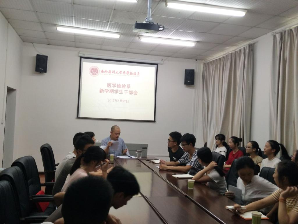 2017年8月27日下午3:00时,医学检验系在忠山校区跃进楼三楼会议室召开新学期学生干部会议。医学检验系学生科科长陈勇,团总支书记陈思,主席团、各部门、班团干部等全体学生干部参加会议,会议由陈勇主持。