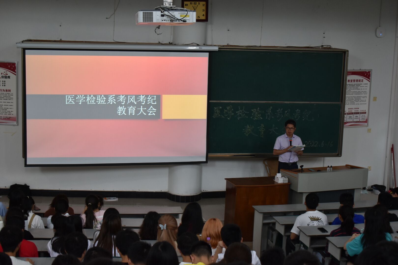 为了进一步加强同学们的考风考纪教育,营造诚信考试氛围,促进期末考试公平进行,倡导同学们“端正考风、严肃考纪、文明答题、诚信应考”,6月16日上午,医学检验系在城北校区荟文楼201教室召开了医学检验系考风考纪教育年级大会。学生科科长李尚学、辅导员刘岩恕以及2020级、2021级全体学生参加了大会。会议由刘岩恕主持。