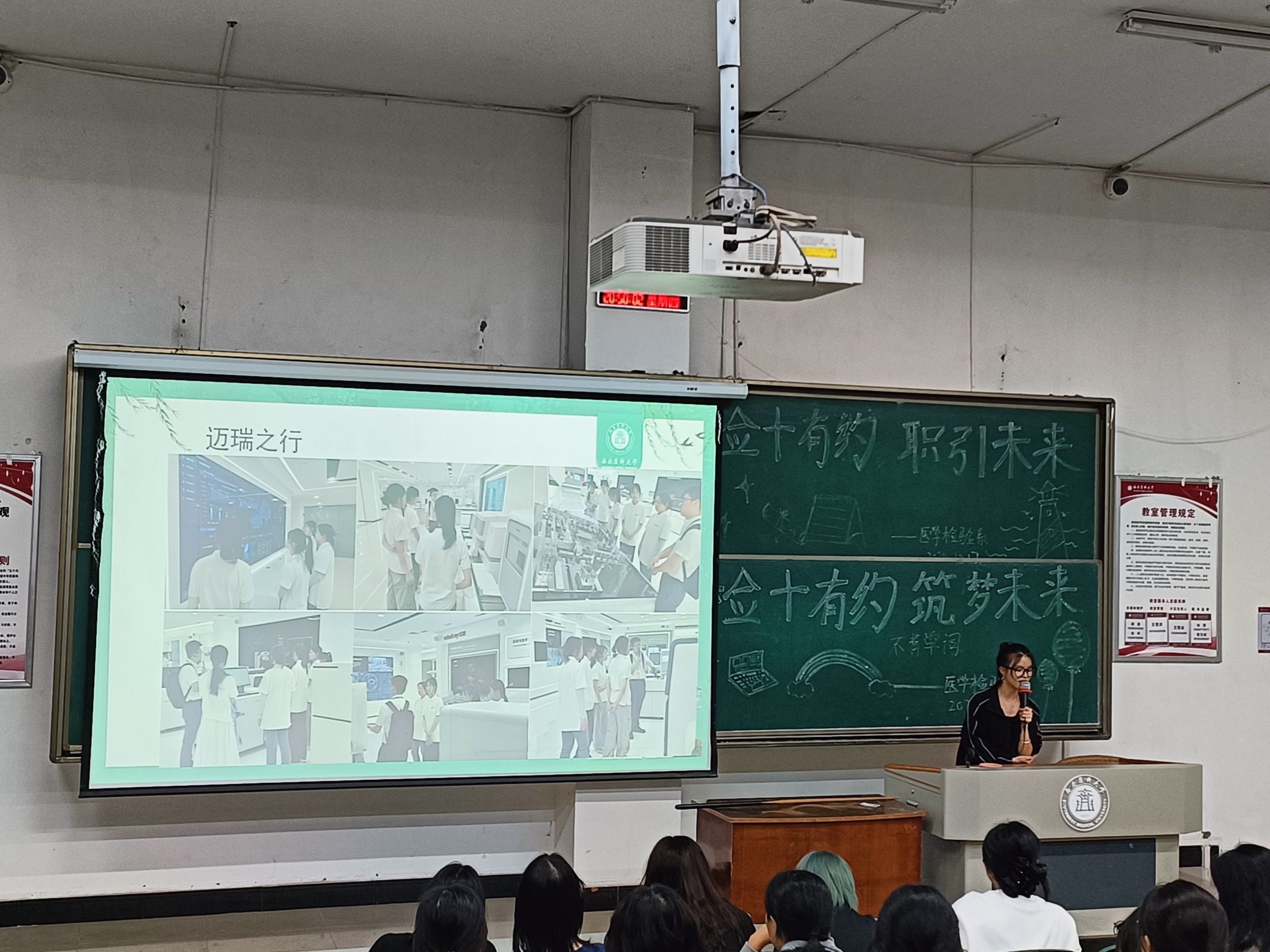 10月18日晚,医学检验系在城北校区荟文楼105教室举办“‘检+’有约·‘职’面未来”职业体验分享会,本次活动由医学检验技术专业2022级学生周晨主讲,医学检验技术专业2023级和2024级全体同学们参加。
