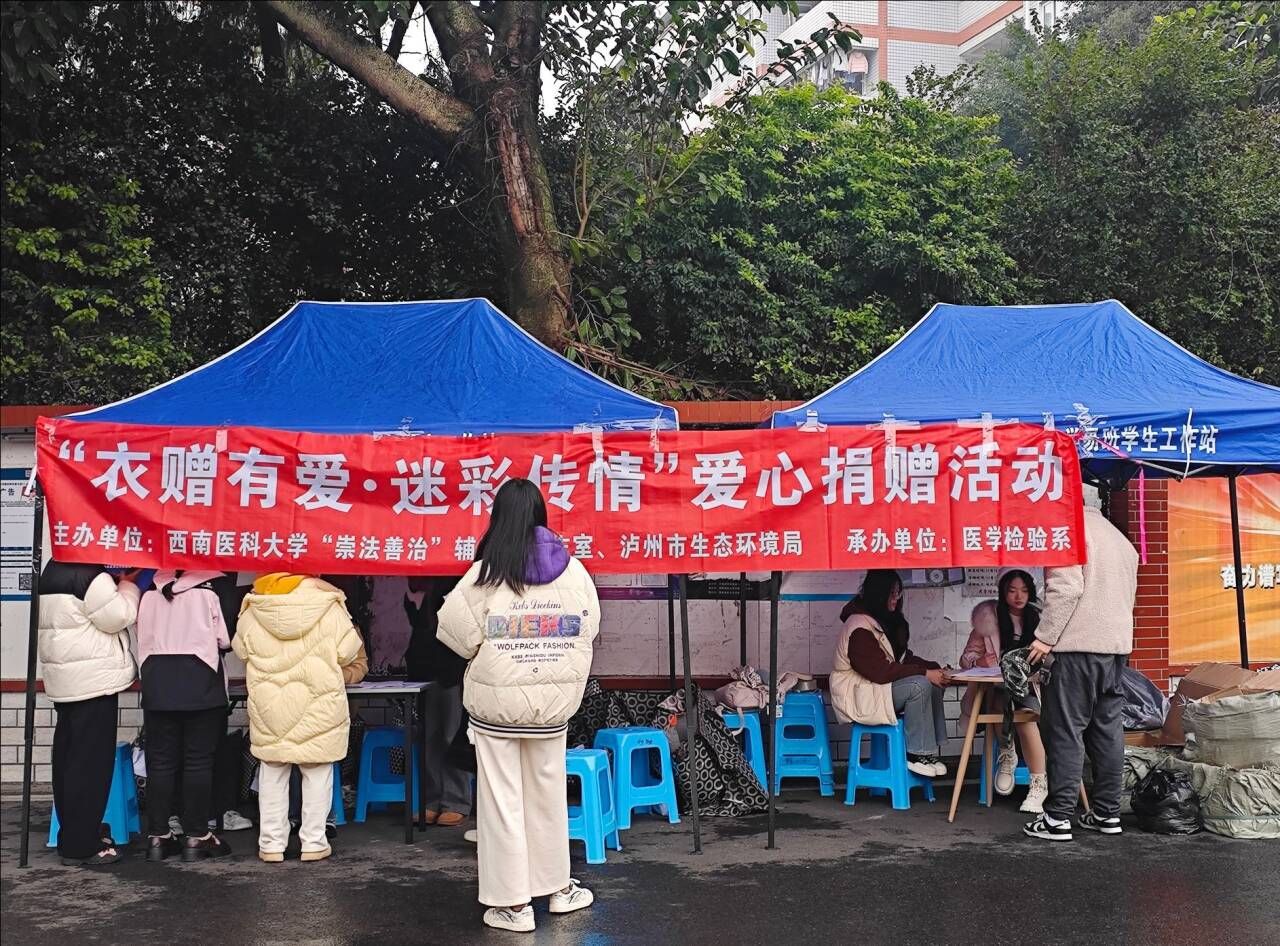 12月19日,由beat365官方网站“崇法善治”辅导员工作室、泸州市生态环境局主办,医学检验系承办的“衣赠有爱·迷彩传情”爱心捐赠活动在桂香苑食堂门前爱心捐赠点举行。捐赠活动由医学检验系学生科辅导员刘岩恕主持,医学检验技术专业2024级新生志愿者参加。
