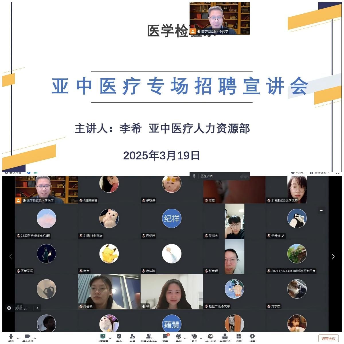 3月19日晚,医学检验系通过腾讯会议平台线上举办亚中医疗专场招聘空中宣讲会,公司人力资源部经理李希出席,医学检验系学生科科长李尚学、2025届全体毕业生参加。宣讲会由李尚学主持。
