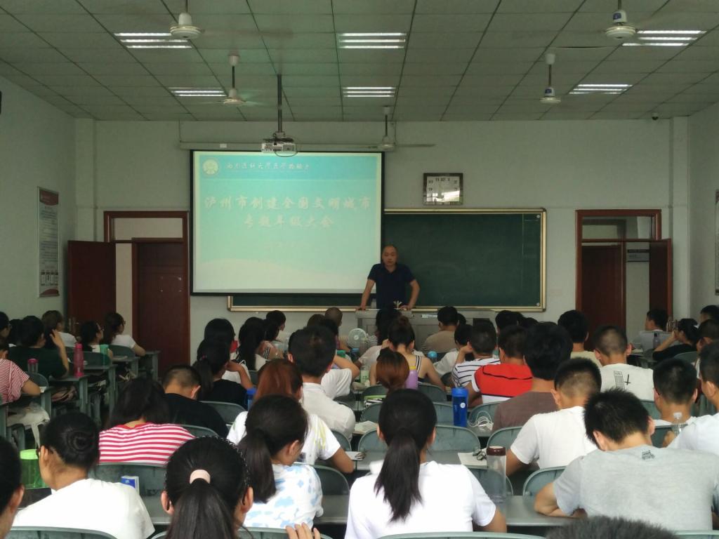 2017年8月29日上午,医学检验系分别在两校区召开了泸州市创建全国文明城市专题年级大会,全体在校同学参会,会议分别由医学检验系学生党支部书记、学生科科长陈勇和团总支书记陈思老师主持。