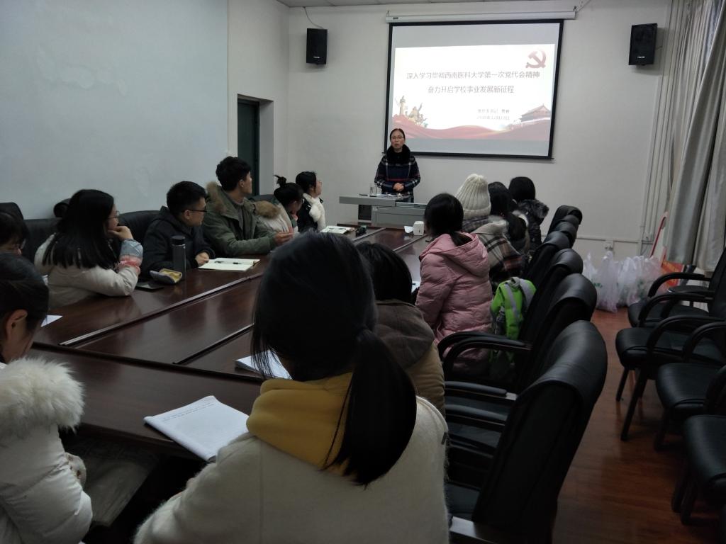 20181212日,医学检验系第46党支部在跃进楼医学检验系会议室举办了“深入学习贯彻beat365官方网站第一次党代会精神奋力开启学校事业发展新征程”为主题的讲座,本次讲座由医学检验系党总支书记黄君主讲,第46党支部全体党员参会。