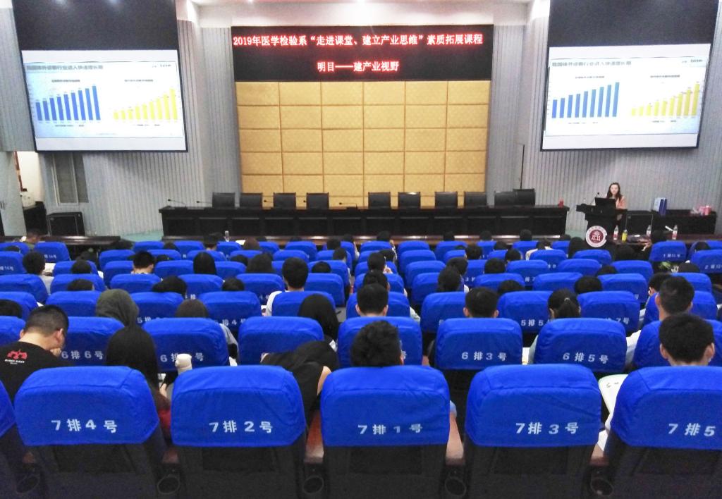 为培养并提高医学检验系学子的创新创业思维,特开设“走进课堂·建立产业思维”素质拓展系列课程。第一课“明目——建产业视野”由孟柯杉主讲:首先,以“IVD行业”定义开场,说明了体外诊断为临床决策最重要的信息源,并详细介绍了体外诊断产品的分类。然后,以公司的视角分析了体外诊断行业的“高壁垒”以及发展趋势,并从外部环境分析——IVD产业链的构成和国内外市场对比,让同学们树立了行业思维,也拓宽眼界。最后,行业综合分析了检验技术发展趋势等,使同学们对医学检验行业的未来有了更为明朗的认识和长远的眼光。