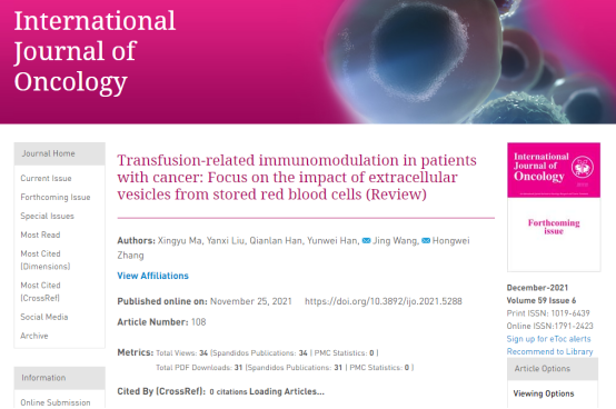 近日,beat365官网医学检验系2018级本科生马星宇同学在医学检验系张洪为副主任技师的指导下,以第一作者的身份在国际知名学术期刊《International Journal of Oncology》上在线发表题为《Transfusion-related immunomodulation in patients with cancer: Focus on the impact of extracellular vesicles from stored red blood cells》的学术论文,期刊影响因子为5.65。该论文是马星宇同学负责的国家级大学生创新创业计划项目“红细胞衍生的细胞外囊泡对肺癌患者的输血相关免疫调节作用”的研究成果。
