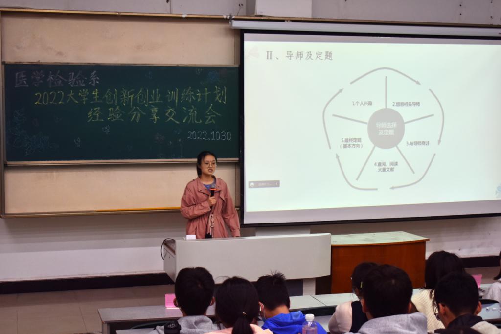 为营造浓厚的大学生创新创业氛围,激发学生参与大学生创新创业活动的热情,10月31日晚,医学检验系在城北校区荟文楼103举办大学生创新创业项目申报经验交流分享会。医学检验系辅导员刘岩恕,2020级、2021级和2022级全体同学参加线上会议和线下会议。本次分享会邀请省级大学生创新创业项目获得者2019级谢佳利作经验分享。