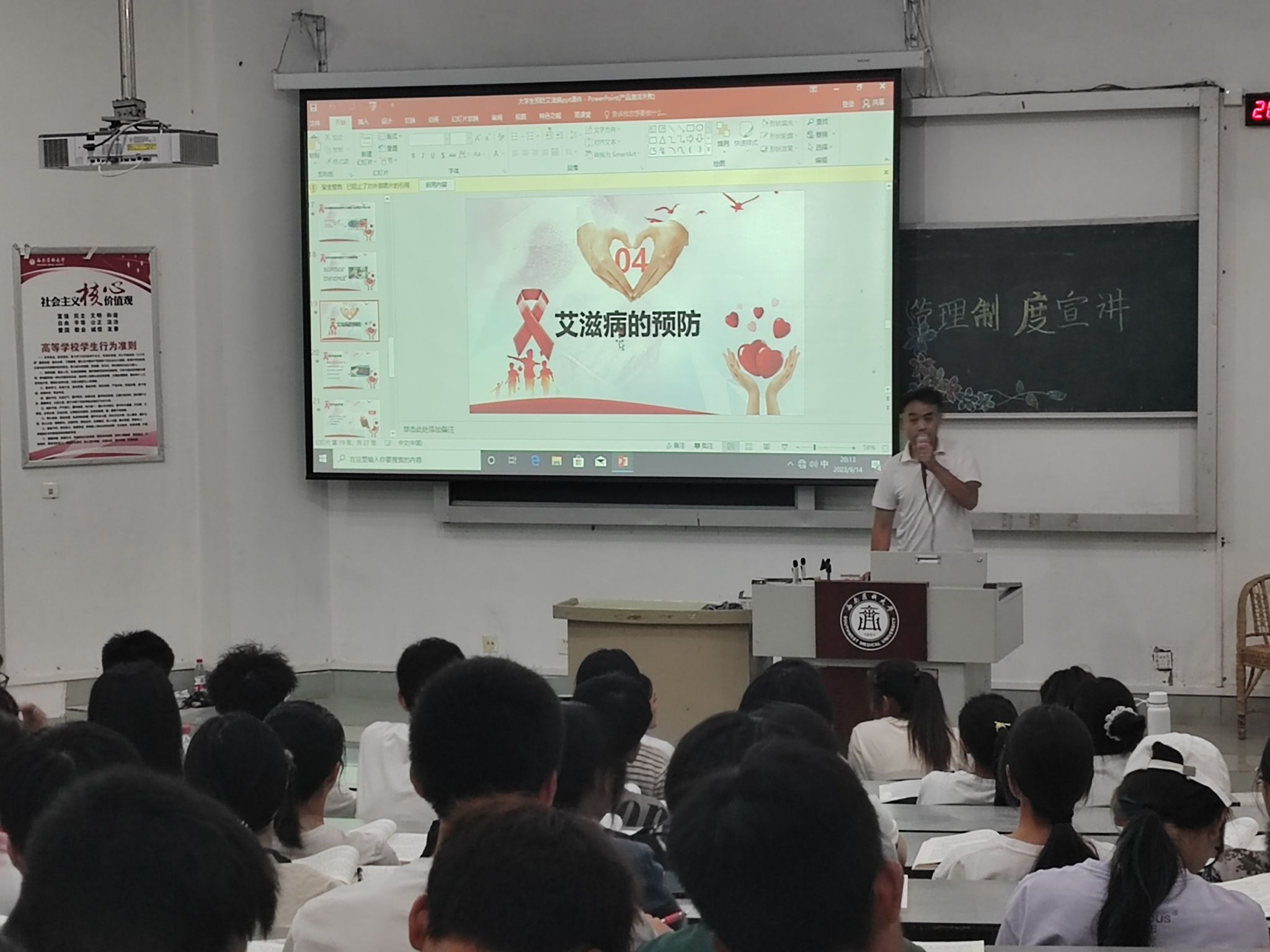 9月14日晚,医学检验系在鸿文楼204教室开展2023级新生预防艾滋病宣传教育专题讲座,专题讲座由辅导员刘泸主讲,2023级全体学生参加。