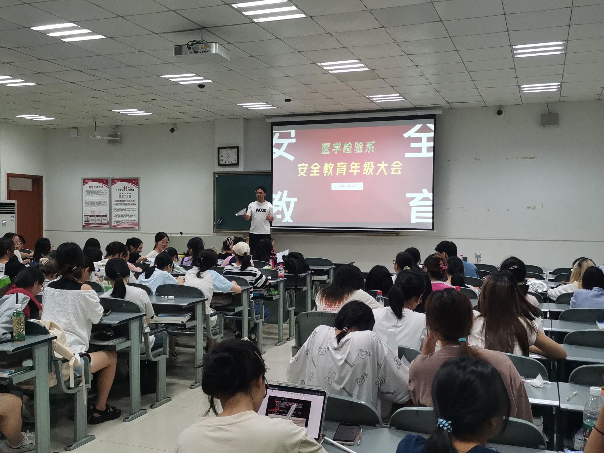 为进一步落实学校安全稳定工作会议精神,扎实做好学生安全教育工作,5月24日上午,医学检验系在忠山校区粒香苑405教室和城北校区明理楼105教室分别召开安全教育年级大会,2023级、2022级学生在城北校区参加,2021级学生在忠山校区参加,会议由医学检验系辅导员刘岩恕和刘泸主讲。