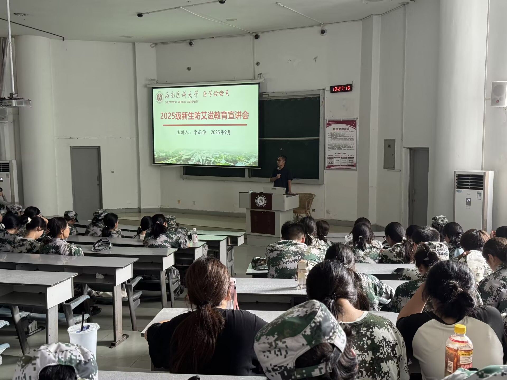 为增强2025级医学检验技术专业新生对艾滋病的认知与防范意识,树立正确防艾观念和生活态度,提高自我保护能力,2025年9月11日,医学检验系于明理楼105教室开展防艾滋病教育讲座,会议由学生科科长李尚学主讲,辅导员刘岩恕和2025级全体新生参加。