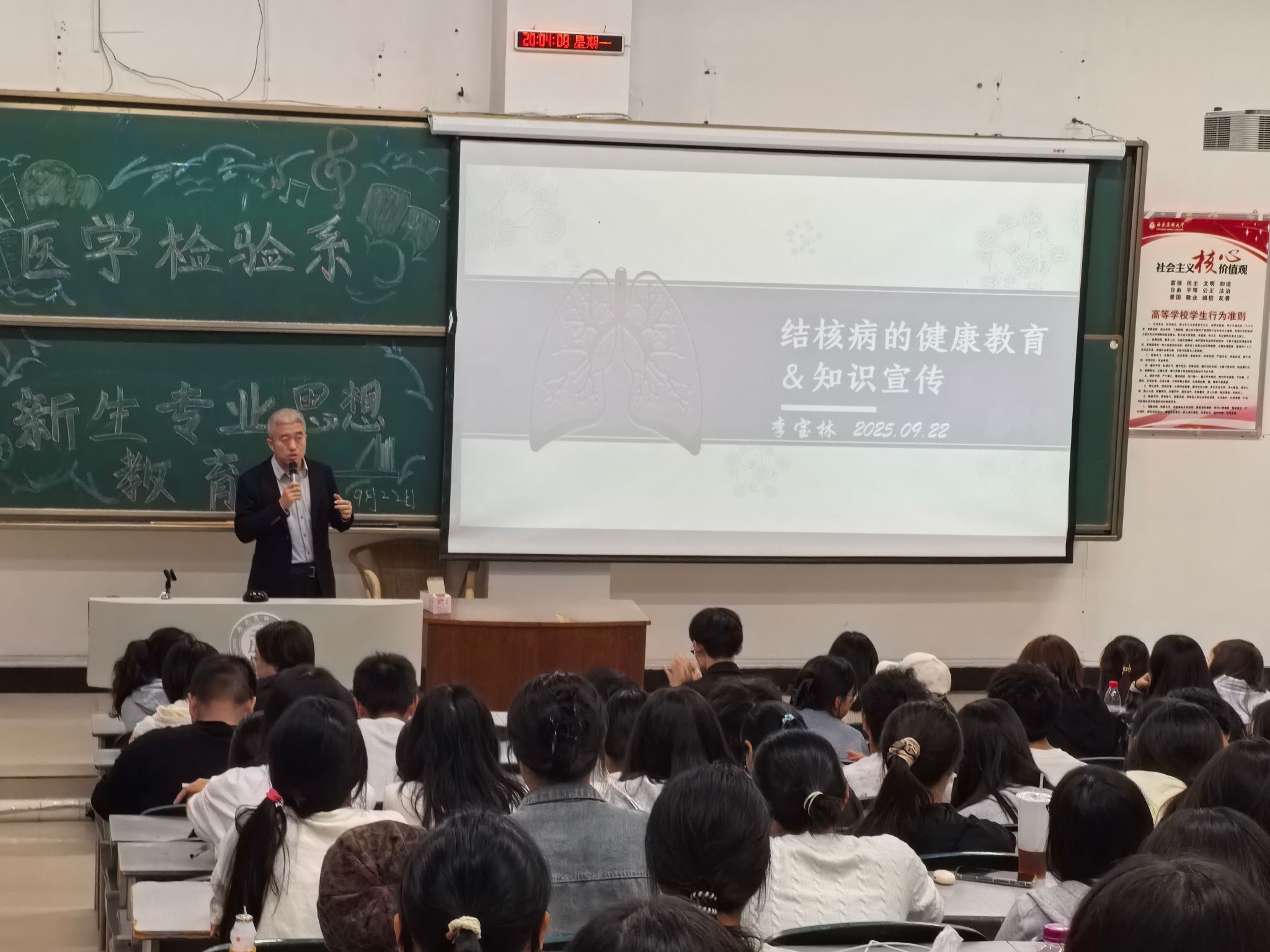为进一步增强2025级医学检验技术专业新生对传染性疾病的认知与防范意识,树立正确的生活态度,提高自我保护能力,2025年9月22日,医学检验系于荟文楼104教室举办了传染性疾病防治专题讲座,讲座由医学检验系分子生物学教研室主任李宝林主讲,学生科科长李尚学主持,2025级全体新生参加。