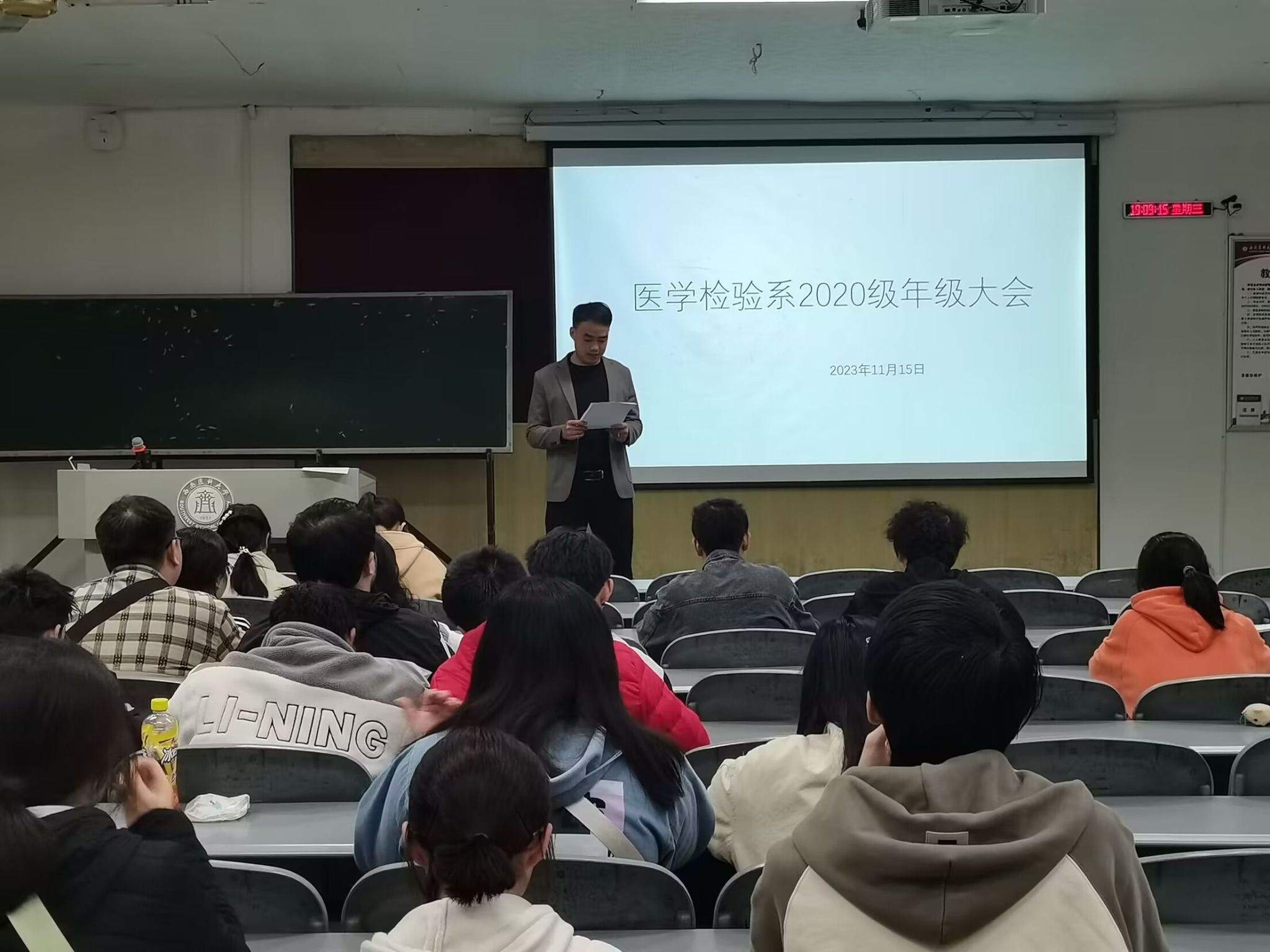 医学检验系于11月15日晚在忠山临床演播厅召开年级大会,会议由刘泸主持,2020级全体学生参会。