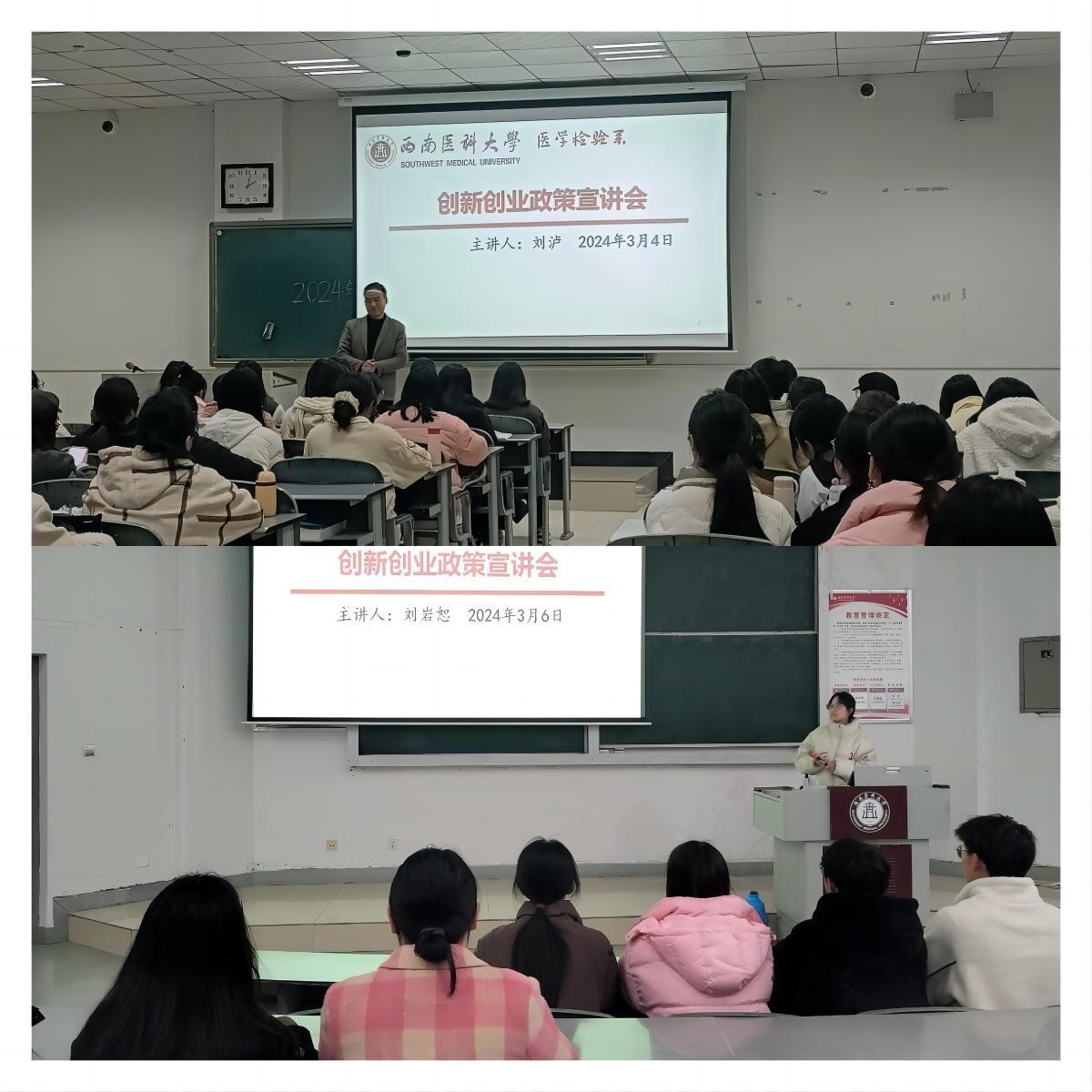 “大众创业,万众创新”。为激发同学们的创新创业热情,培养学生的创新思维和实践能力,3月4日和3月6日,医学检验系在忠山校区第5阶梯教室和城北校区明理楼105教室举办创新创业政策宣讲活动。本次宣讲活动由辅导没刘泸和刘岩恕分别主讲,2020级、2021级在忠山校区参加,2022级、2023级在城北校区参加。