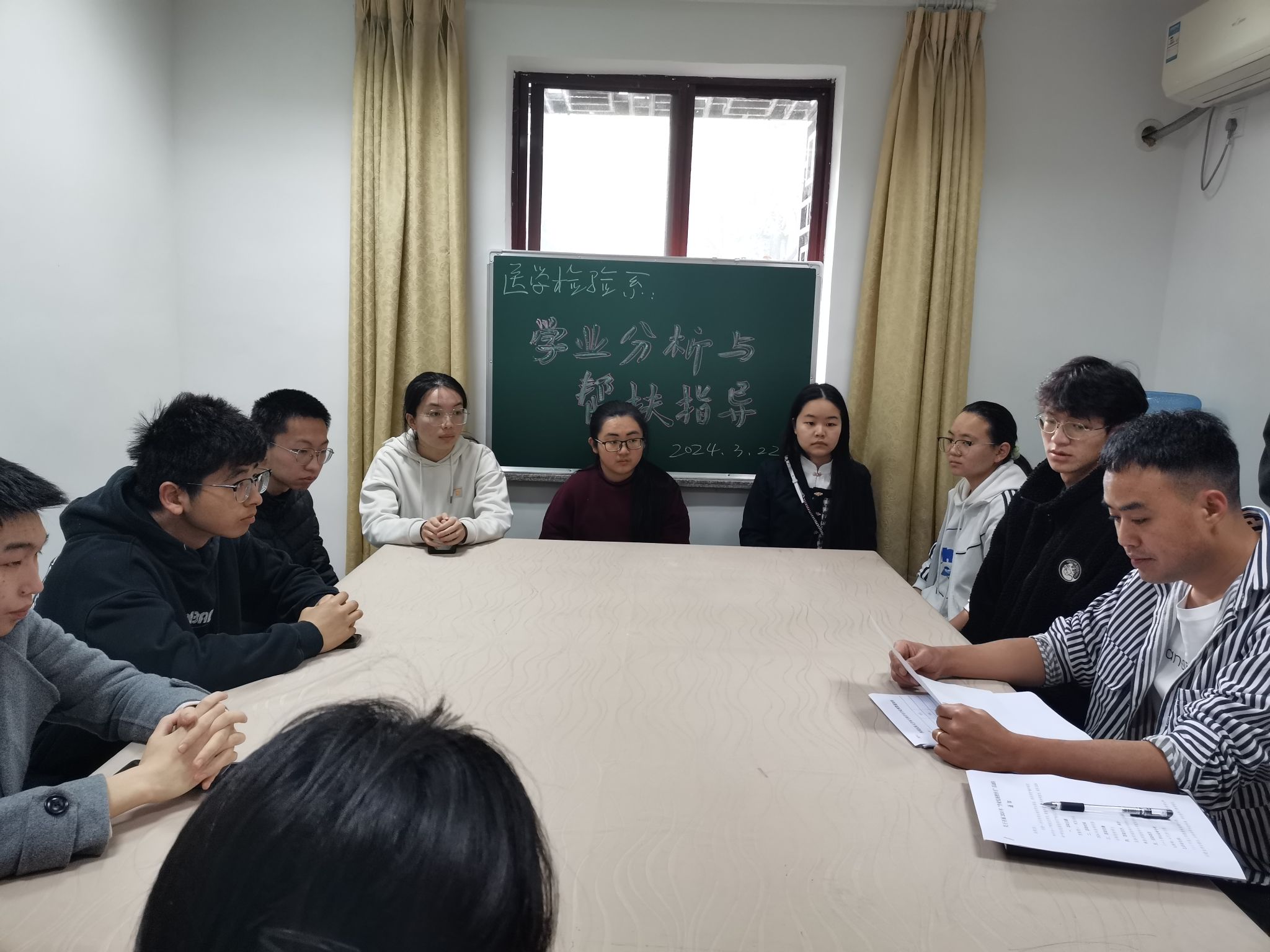为进一步做好学生学业发展指导月相关工作,全面分析学生学业水平以更好地开展学业帮扶工作,3月22日上午,医学检验系在西山楼211会议室开展学生学业分析与帮扶指导活动,医学检验系学生科科长李尚学、辅导员刘泸,15名学业业后进学生参加了帮扶活动。