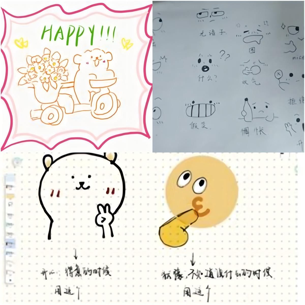 此次主题活动以校园情绪表情包设计为主题,向同学们征集手工简笔画或自制图片等原创内容来表达“压力”、“快乐”、“失落”、“惊喜”等情绪表情,并配一小段文字描述使用情景,或给作品描绘一个表情包“小故事”,最后将作品提交至易班优课进行评选打分。在征集到的作品中,同学们以多元的视角和细腻的笔触,将心理健康主题融入创作,形成了一幅幅温暖、幽默或发人深省的作品,充分展现了大学生丰富的心理活动。简单的简笔画以简洁线条勾勒生动情绪,既有俏皮可爱的日常表情包,也有充满哲思的情绪符号。参与者利用自制图片拼贴、摄影、电子绘图等形式,围绕学业压力、人际交往等主题展开创作。有的作品以蒙太奇手法拼接校园场景,隐喻成长中的迷茫与突破;有的通过光影对比展现情绪转化过程,配以短句,引发观者对自我疗愈的思考;其中,手绘、水彩、板绘等色彩浓郁的作品成为亮点。创作者通过色块碰撞、抽象图案与具象场景的结合,描绘心灵世界的斑斓图景,用视觉语言传递“与自我和解”的积极态度。