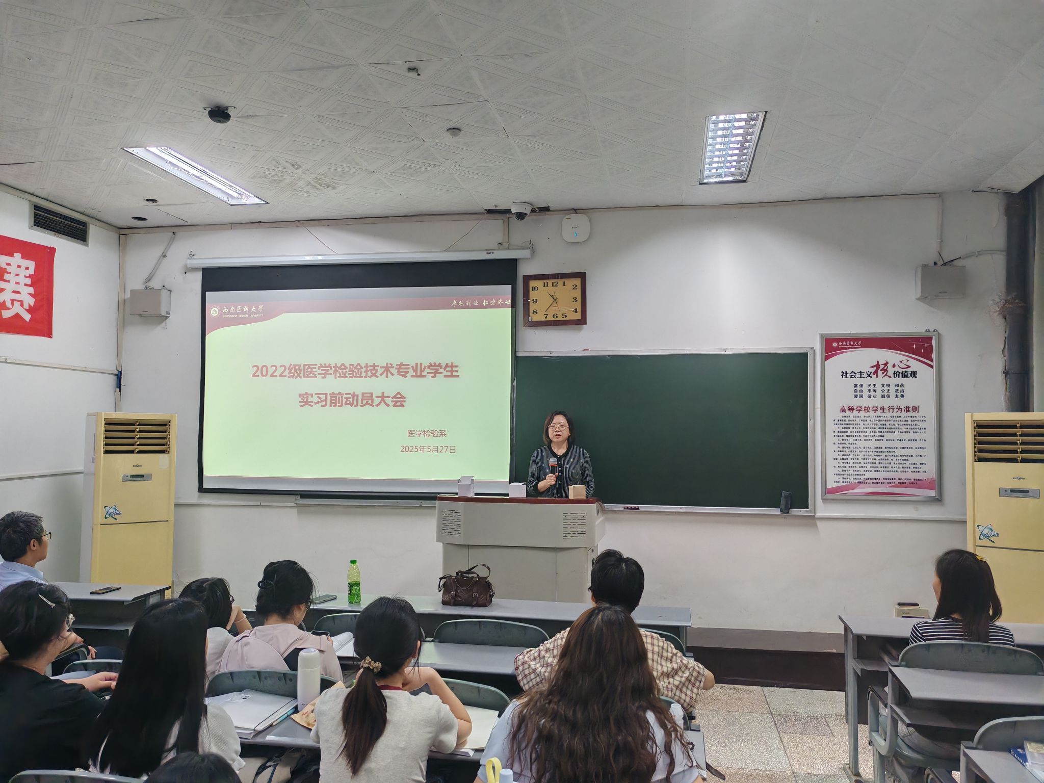 为进一步帮助学生适应实习阶段的学习生活,合理规划大学阶段最后一年的学习生涯,5月27日上午,医学检验系在忠山校区图书馆502教室召开2022级学生实习动员大会。医学检验系主任刘靳波、学生科长李尚学、教师代表和基地实习指导教师代表及2022级全体学生参加。会议由党政办主任朱喜丹主持。