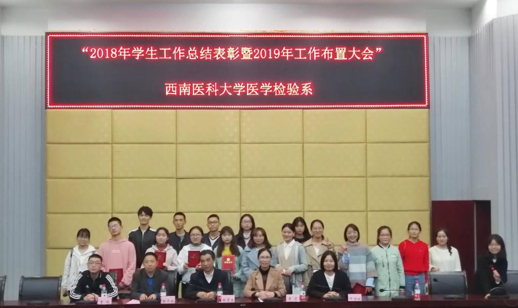 大会在校歌《忠山红日》中拉开序幕。何顺姣主持会议,第一个议程“2018年学生工作总结表彰”。首先,全体人员观看了4分钟的视频,共同见证了2018年医学检验系的发展和同学们的成长。然后,学生会常务副主席杨欣悦向大会总结汇报了2018年团学组织工作;陶华林宣读了《医学检验系学生工作2018年度获奖情况》和《关于表彰医学检验系第二届典型先进集体及个人的决定》;张碧国、陶华林、黄君、李咏分别为“典型先进集体及个人”颁发了奖牌及荣誉证书;优秀学生代表余红艳做了精彩发言,分享了学习经验,也衷心地表达了对学校领导、院系老师的感谢。