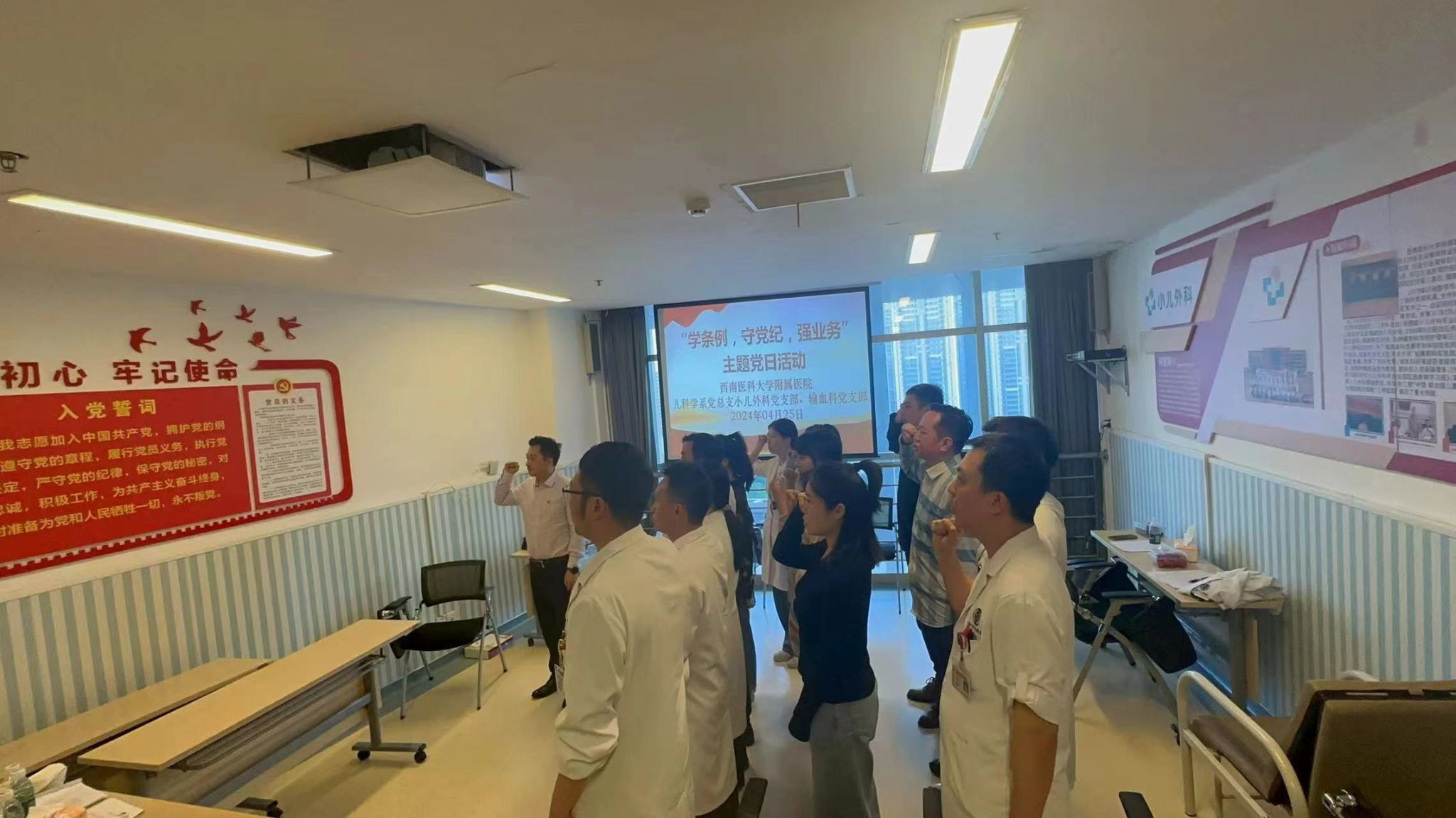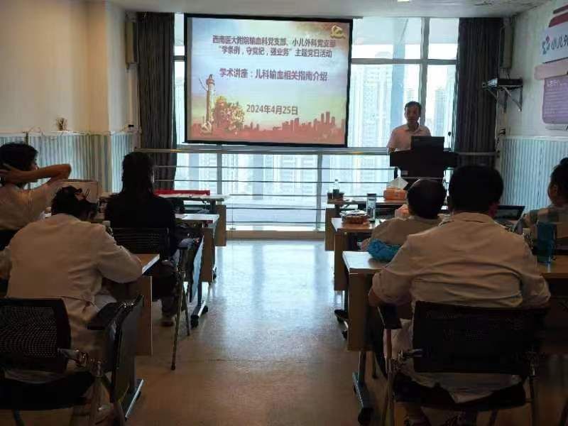 党纪学习之后,张洪为为大家带来学术讲座《儿科输血相关指南的介绍》,对儿科领域近年来发布的相关输血指南和专家共识进行了梳理和比较。大家就各种指南及专家共识的优缺点和日常工作中的输血相关流程展开了热烈交流和讨论。小儿外科刘铭教授进行了总结讲话,他对本次活动的开展给予了充分肯定,并希望大家要以患者为中心,勤思考,多学习,加强合作,强化执行,为医院的事业发展作出贡献。活动最后,与会党员重温入党誓词,并合影留念。