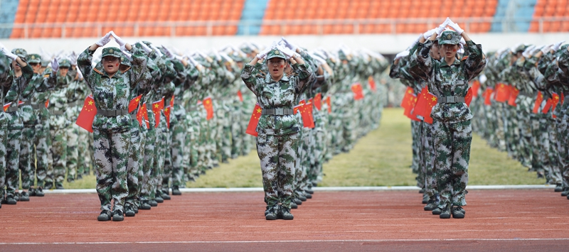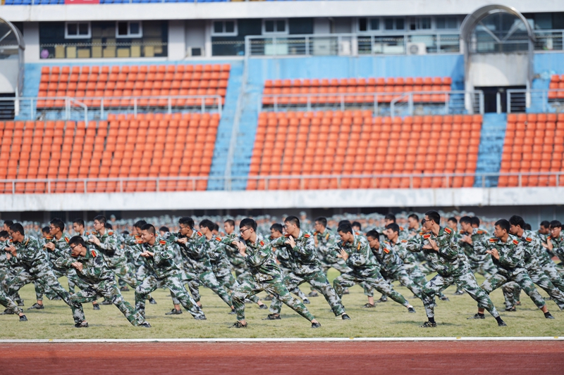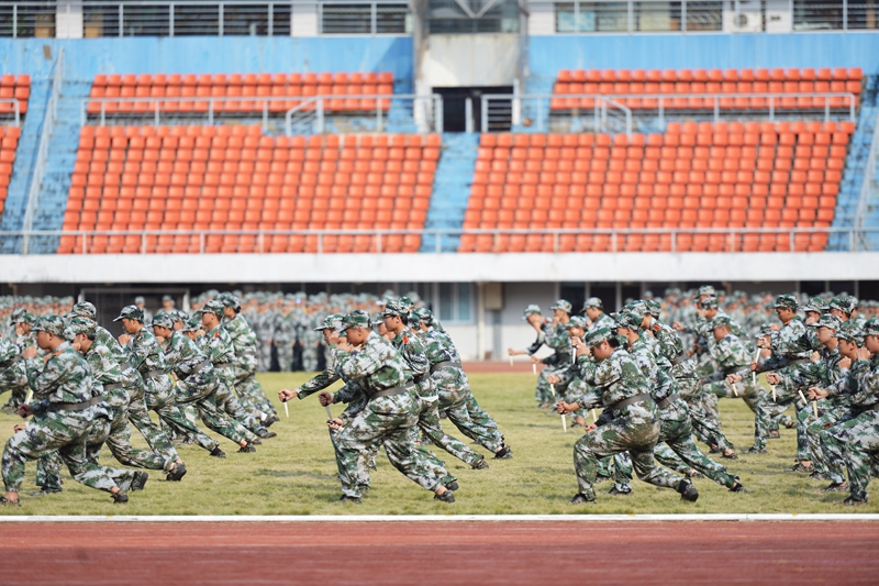 分列式结束后,新生们进行了精彩的擒敌拳、匕首操汇报表演,整齐划一的动作、势破重霄的呐喊,充分展现了同学们的青春风采,赢得了全场经久不息的掌声。
