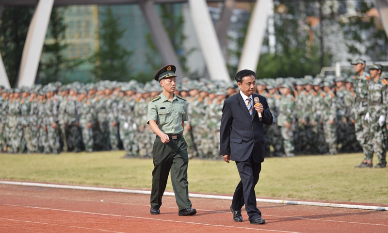 在新生们期待的目光中,党委常委、副校长刘广益在阅兵指挥官的陪同下,逐一检阅各连队方阵。“同学们好!”“同学们辛苦了!”亲切问候鼓舞士气、振奋人心。