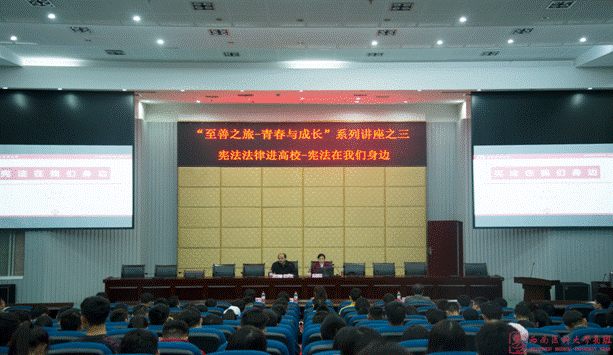 根据全省高校宪法知识宣讲活动实施方案和beat365官方网站“宪法法律进高校”工作方案的安排,为推进法治校园建设,增强师生的法律意识和法治观念。11月2日晚7点,由学校普法工作领导小组办公室与学生工作部联合主办的“宪法法律进高校”知识讲座暨“至善之旅-青春与成长”系列讲座第三讲在城北校区第二学术报告厅举行,讲座邀请了泸州市七五普法讲师团讲师、法学院副教授唐义红作题为“宪法在我们身边”的专题讲座。讲座由武装部·保卫部(处)副处长杜杰主持。学生工作部部长张碧国、学生工作部学生思想教育科副科长苏娜、武装部·保卫部(处)办公室副主任董颋婷,2018级、2019级各班班长、校级学生组织代表等近300余人参加了讲座。