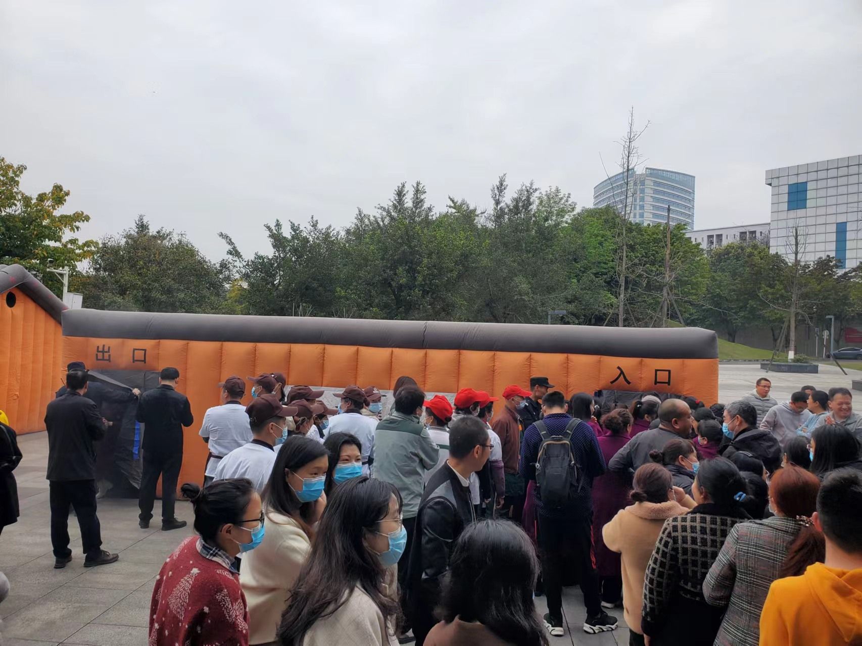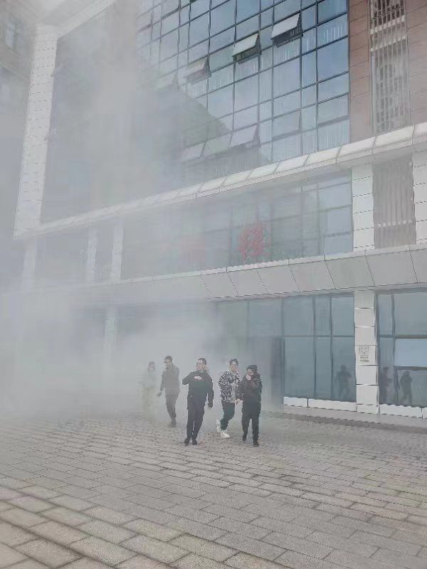 16:00,演练正式开始。校卫队员分别在弘润楼舍1楼、3楼、6楼点燃烟雾,假想弘润楼1楼、3楼、6楼某实验室发生火灾,随即火灾警报拉响,播音广播播放“火灾发生,请全体人员立即疏散。”接到指令后,所有疏散员、引导员立即到位,指挥、引导全体师生按照疏散路线,用手帕、纸巾等捂住口鼻,低头弯腰穿过浓烟,有序疏散。演练中,师生员工服从指挥、配合密切、行动迅速、紧张有序,仅仅3分钟,200余名师生全部疏散至安全区域。随后,保卫人员进楼逐层查看有无逗留人员,整个演练过程井然有序,达到预期效果。