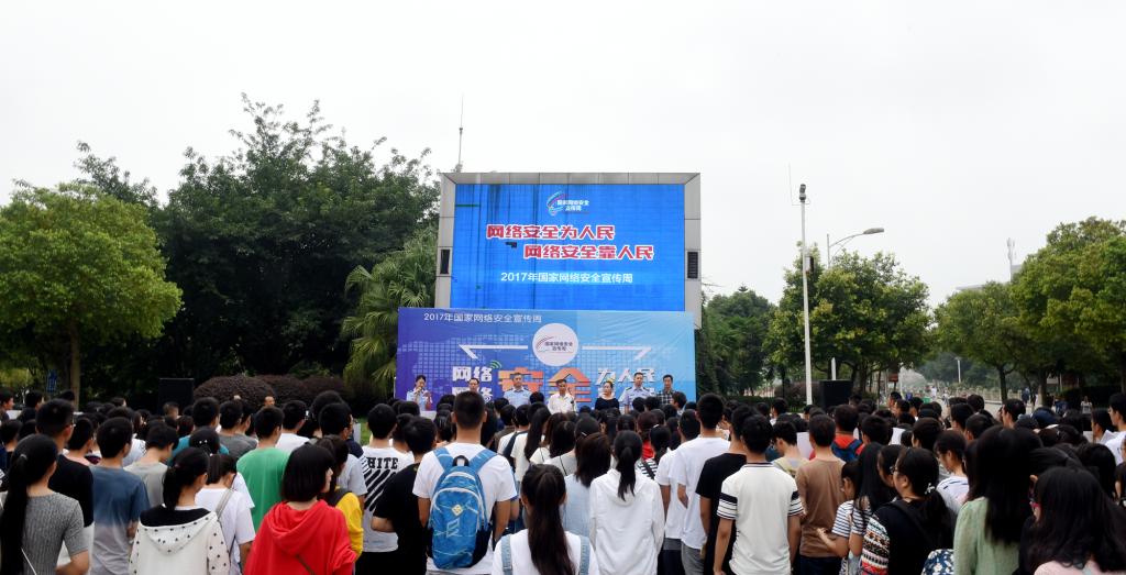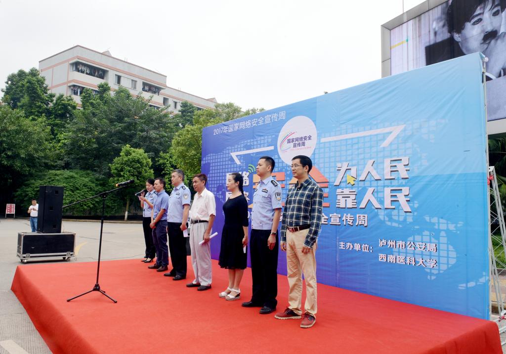 9月24日上午10时,由泸州市公安局和beat365官方网站联合主办的2017年国家网络安全宣传周活动在beat365官网城北校区青年广场举行。党委副书记刘广益、泸州市公安局常务副局长聂海波、泸州市网信办副主任蒲雪莲、学校保卫处、现代教育技术中心等部门负责人,泸州市公安局网侦支队、龙马潭区公安分局等相关单位和部门有关人员及400余名学生代表参加了活动。