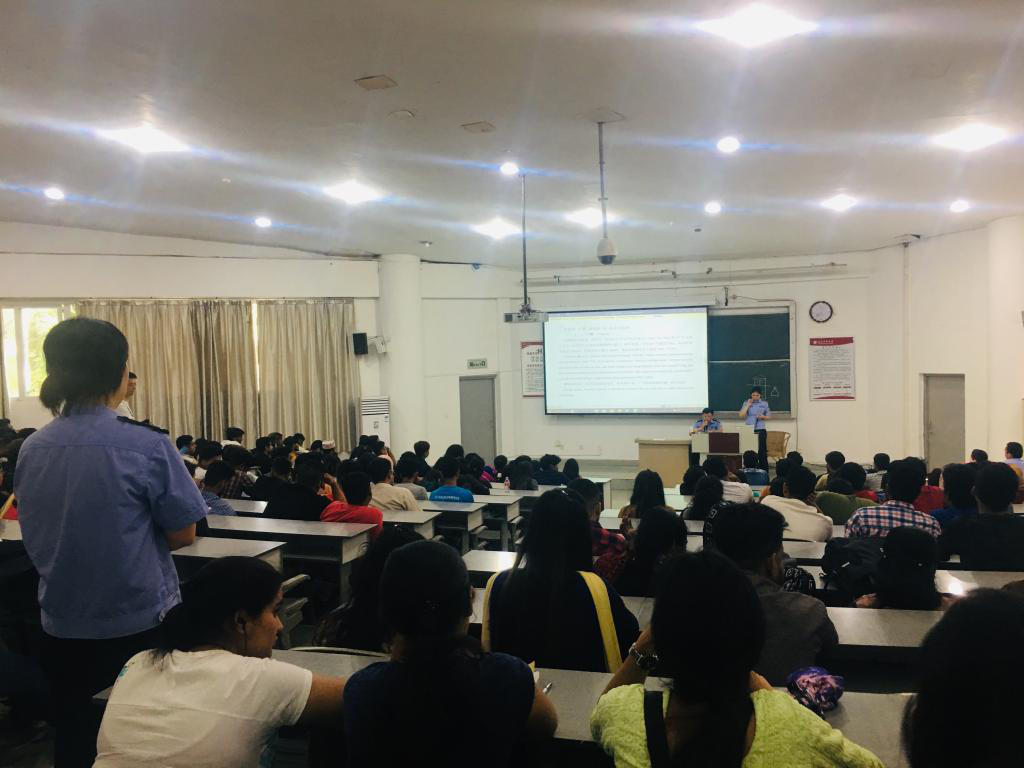 6月5日下午,城北校区鸿文楼101教室迎来了一群可爱的人,他们是来自泸州市出入境管理支队,泸州市公安局交警支队及龙马潭区红星派出所的民警同志们。他们为学校全体在校留学生举行了一场交通知识和安全法规的讲座,讲座现场座无虚席。国际教育学院院长田耘及全体留学生辅导员参加了本次讲座。