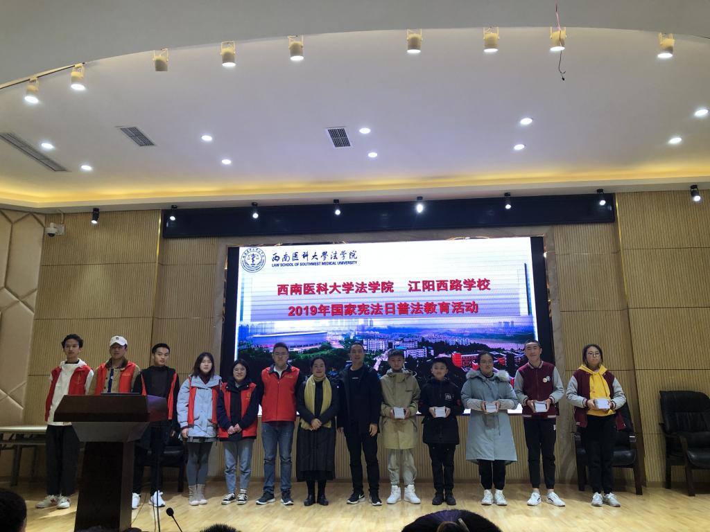 2019年12月4日下午,beat365官方网站法学院青年志愿者在党总支副书记黄莉老师的带领下,前往江阳西路学校开展了“12·4国家宪法日”普法教育活动。江阳西路学校教导处主任叶昌银和300余名初二年级学生参加了活动。